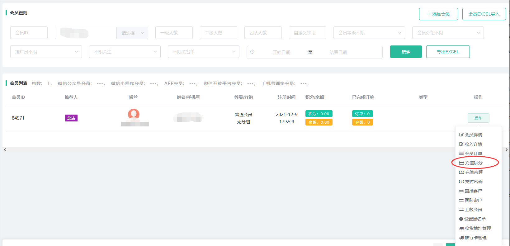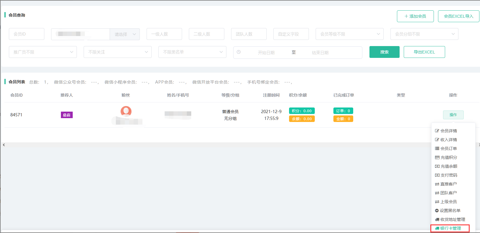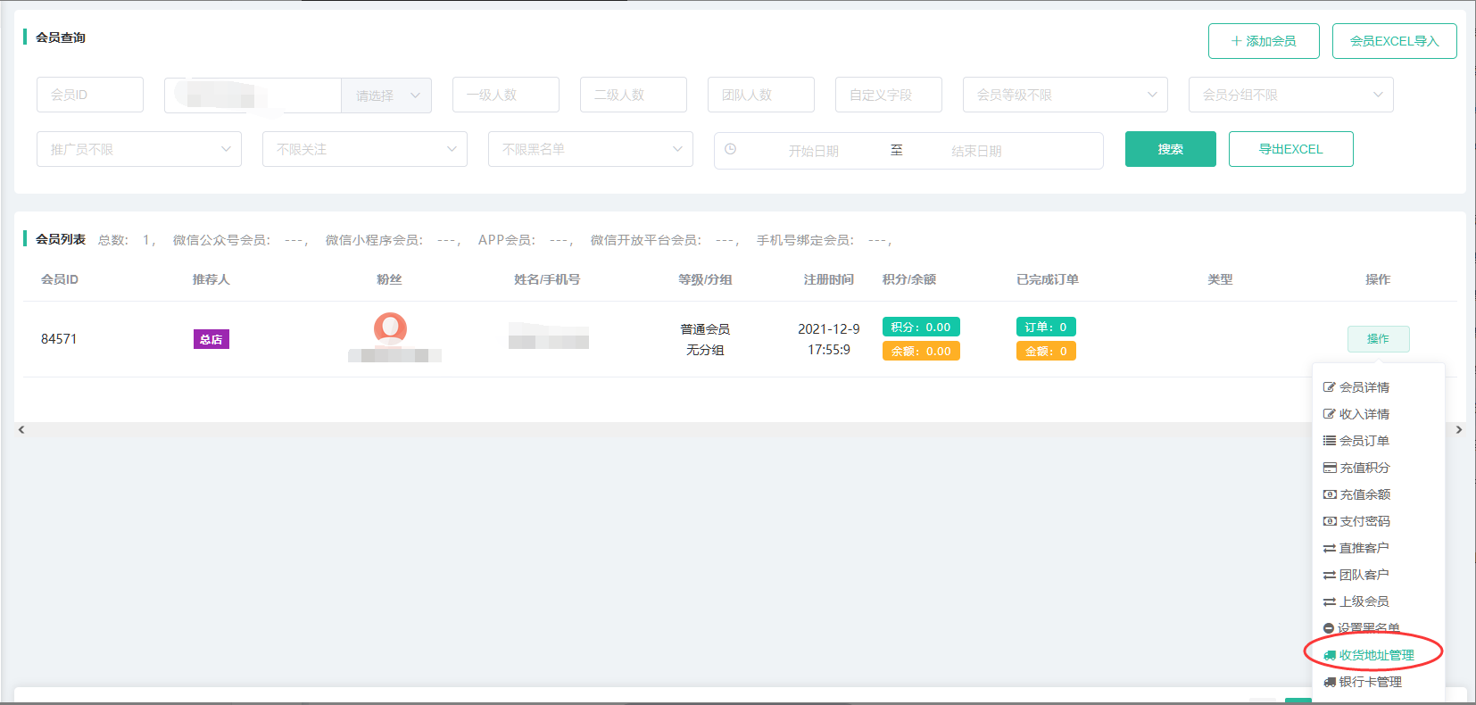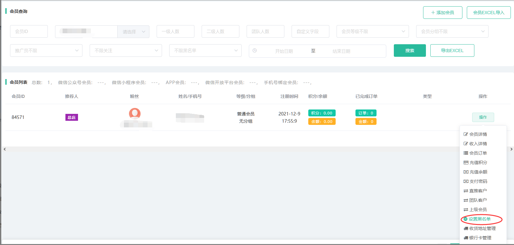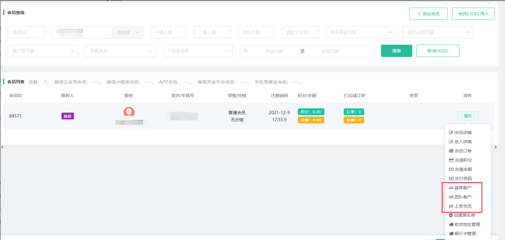 点击“会员管理 -- 操作”下拉菜单查看会员详情、收入详情、会员订单、充值积分,支付密码、直推客户、团队客户、上级会员、充值余额,设置黑名单,银行卡管理,收货地址管理。
