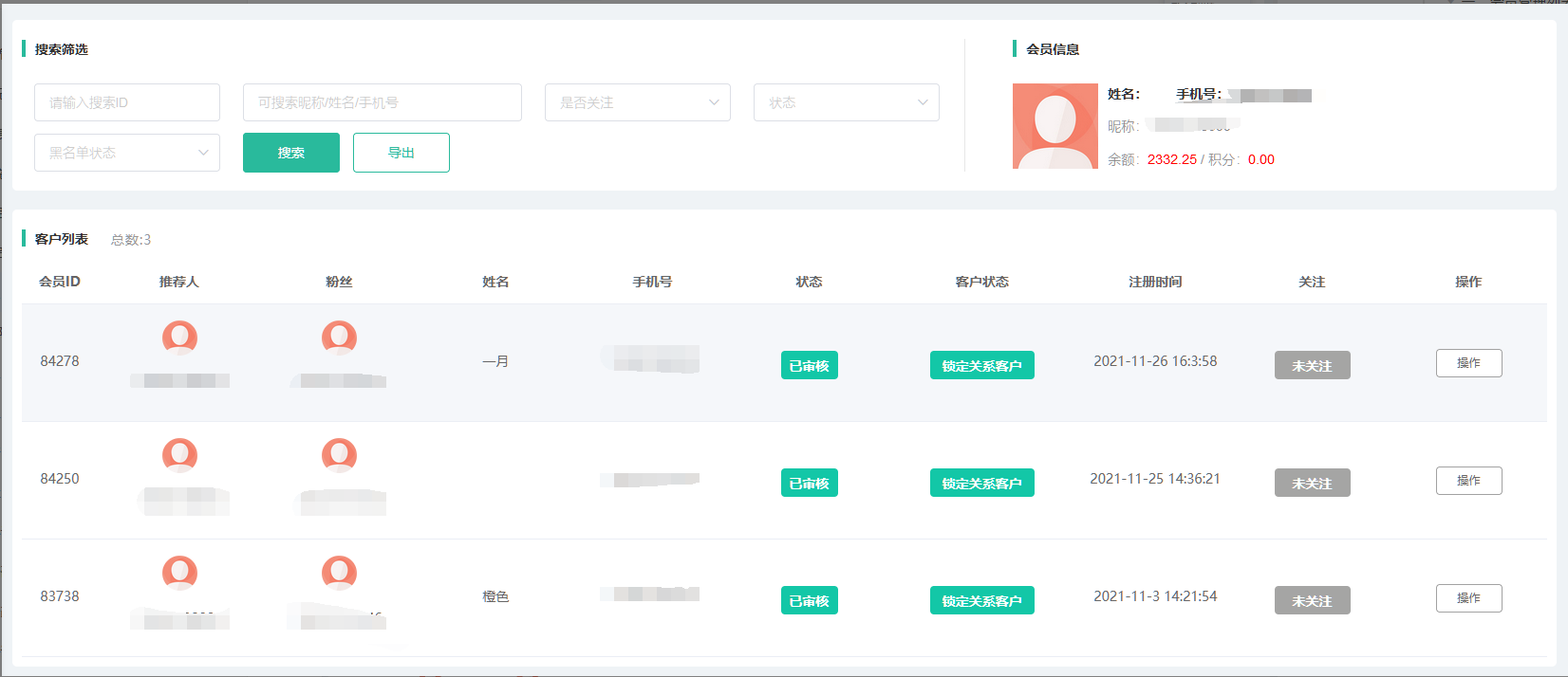 团队客户:搜索会员id,昵称/名称/手机号,页面查看会员关注、黑名单状态、层级和导出表格
