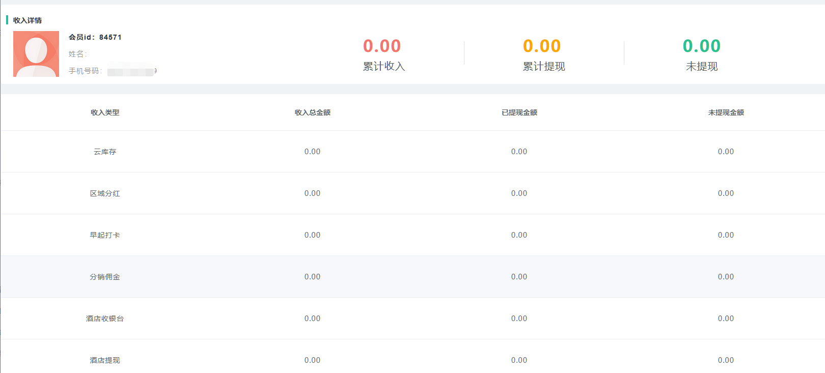 查看会员的所有收入信息,用户获得的佣金、分红、返现等结算后记入收入,未结算的部分不计入收入;统计累计收入、已提现收入、未提现收入;统计区域分红、早起打卡、分销佣金、招商分红、微店分红、门店收银台、门店提现、讲师分红、酒店等累计收入、未提现收入、已提现收入。