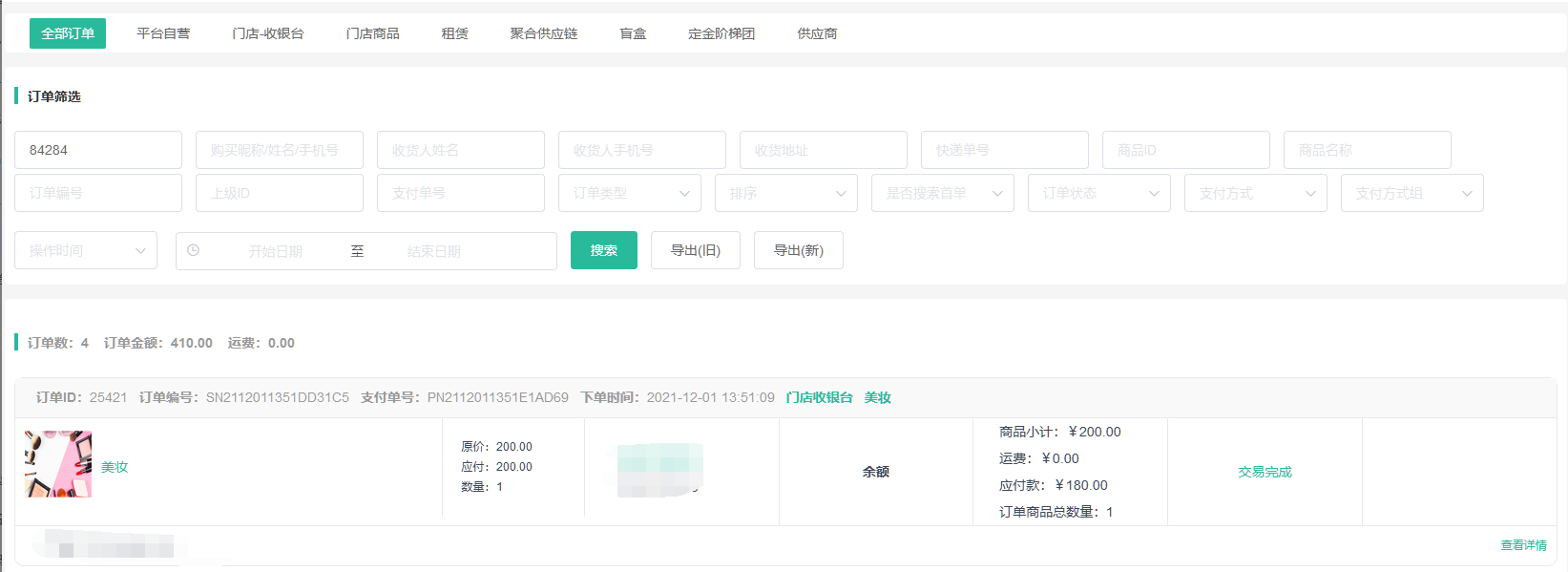快速搜索该会员的全部订单,显示会员在商城成交的订单总数和订单总金额和订单信息