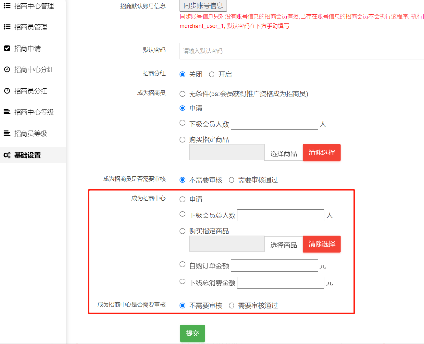 3.设置成为招商中心的条件与成为招商中心是否需要审核。