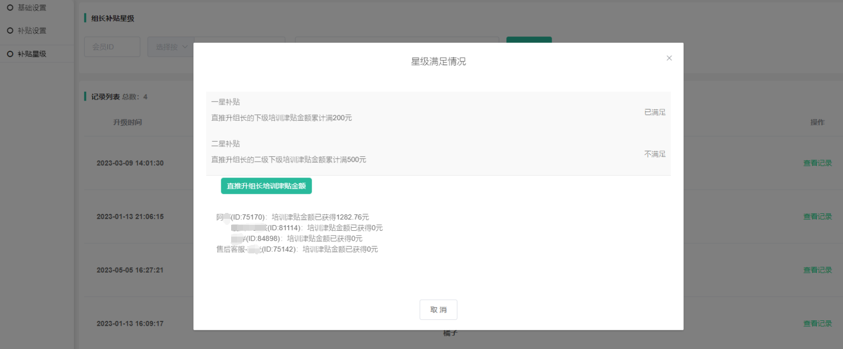 记录列表显示升级时间,会员id,会员昵称,补贴星级,查看记录~