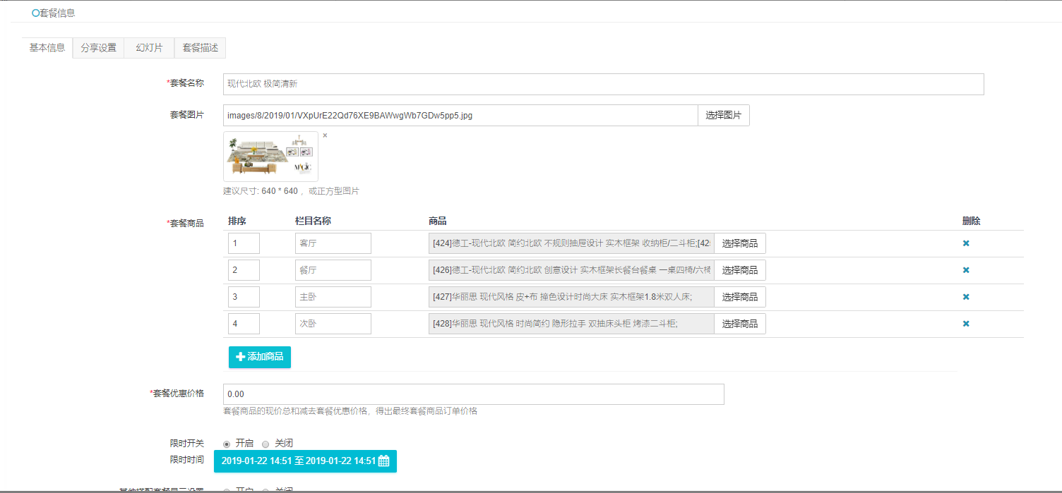 ③ *套餐商品:需要先添加套餐商品栏目,例如栏目1:客厅,然后选择该栏目的商品,