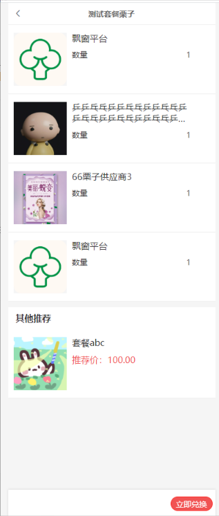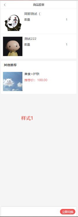 选择样式1,前端点击立即兑换,下单套餐设置的所有商品,若商品有规格则默认第一个规格 。