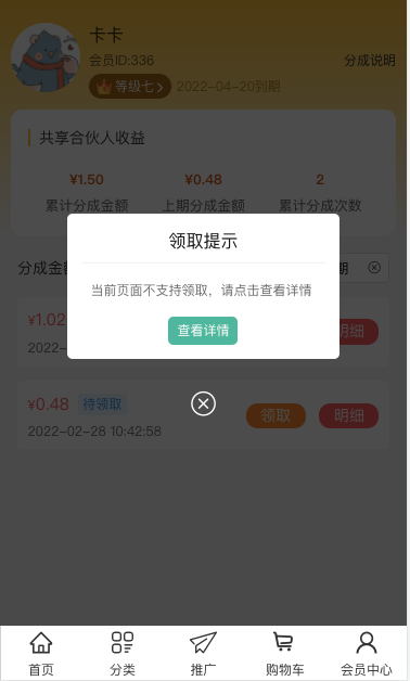 2、在此页面可查看到会员等级信息、共享合伙人收益