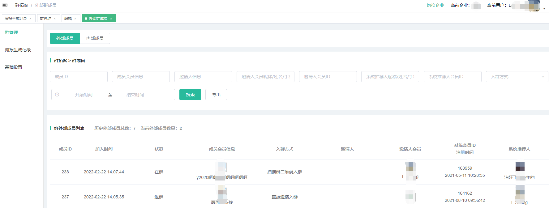 3)邀请人会员,只有通过群拓客二维码邀请的,才能获取到邀请会员,直接拉人进群是没有的.