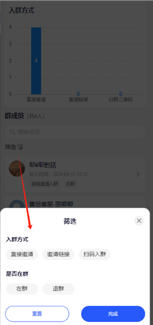 *筛选:入群方式、是否在群、新老会员、是否粉丝