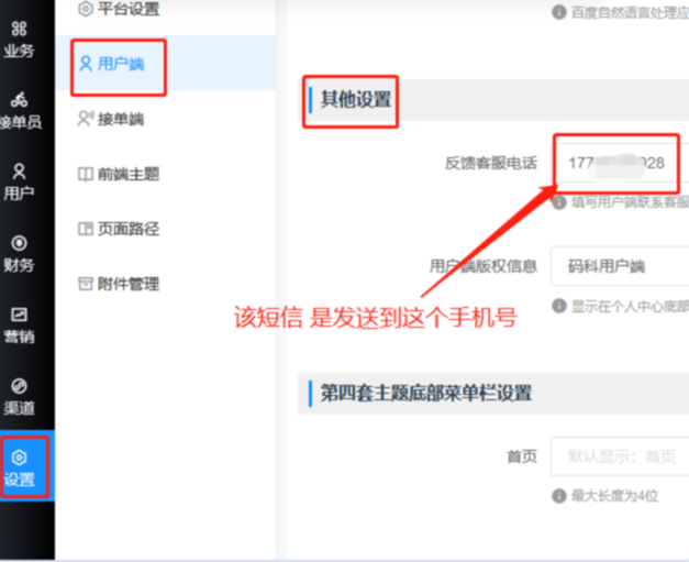 说明:该短信是发送到跑腿平台负责人的手机号,该手机号设置的地方如下图所示。