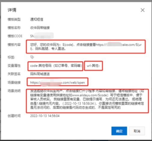 发送跑腿收件码至用户,点击链接打开小程序 内容如需链接,请将链接地址(如链接有变量请使用拼接地址如www.alidayu.com/$code)写于短信模版中,便于审核人员核实。 我链接里面有变量,已按提示填写,为何还无法通过。 拒绝理由是1.链接内无内容。 ( 2022-10-13 18:58:34 ),你直接访问模板里面的链接肯定是无法访问的,后面的链接是代码动态生成的,不是固定写死的