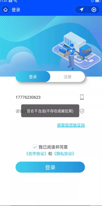 (八)接单端登录获取短信验证码时,提示:签名不合法(不存在或被拉黑)