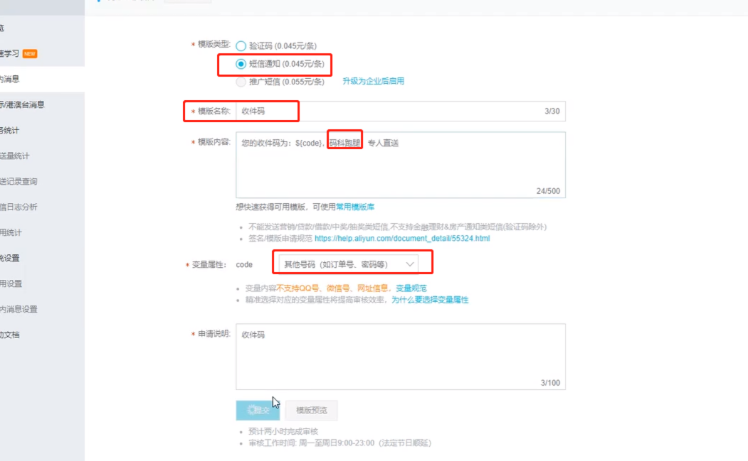模板内容示例:您的收件码为:${code},XX跑腿,竭诚为您服务!