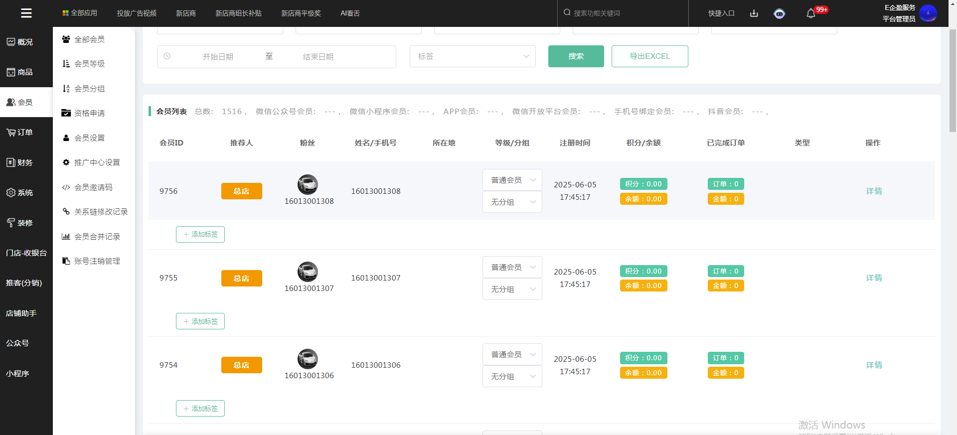 第六步,可以在系统后台--全部会员查看到刚刚导入的会员