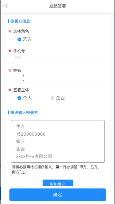*签署角色的添加除了手动填写,还有智能填充、选择历史签署方两种方式,快速填写签署方信息,操作更简单便捷。