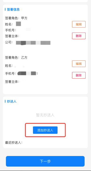 签署方信息都添加完成后,可选择性添加抄送人,然后进入下一步;
