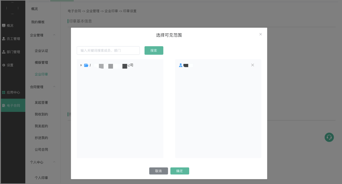 • 注意:如果这里没有勾选模版签署,即使法人授权员工指定合同模版,员工也没有权限发起模版签署。