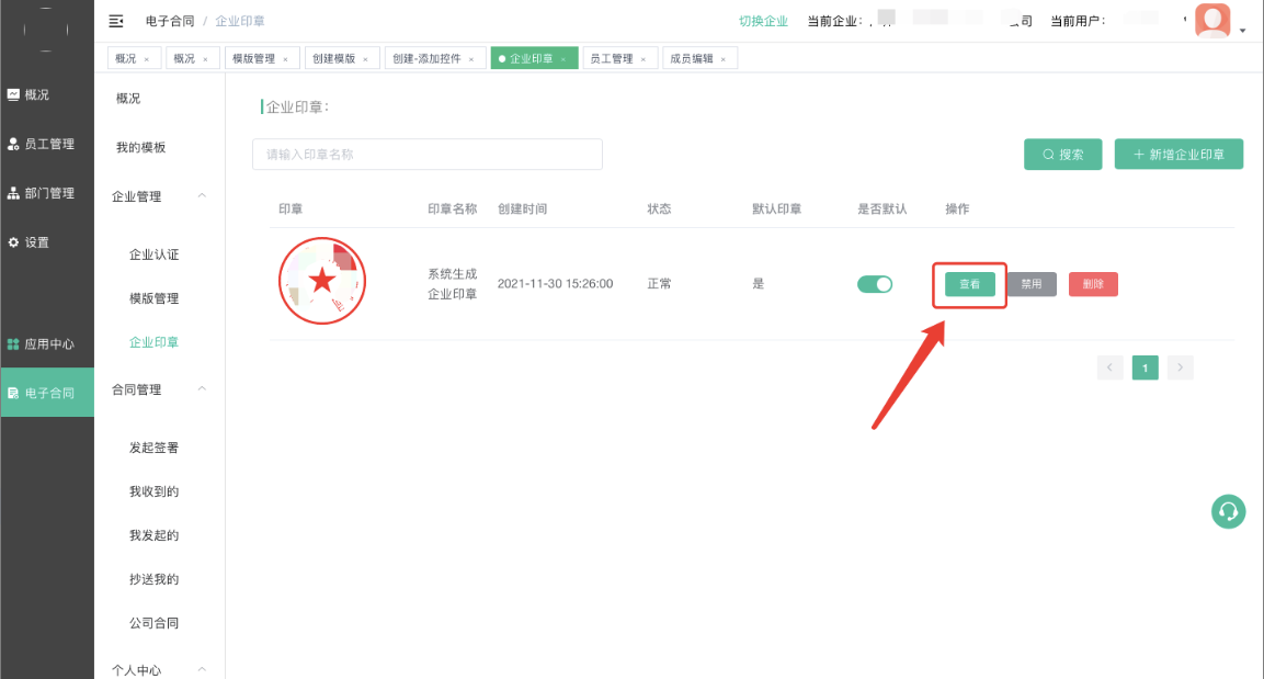 企业认证成功则会自动创建企业印章,只显示当前企业印章,其他企业印章需要切换到相关企业查看管理。
