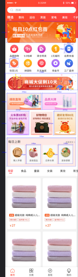 2. 一般图标尺寸可设计为100*100px、或者比100大、比100小的尺寸都可以、例如:84*84、200*200、尺寸没有具体的规范标准、形状为圆形或者正方形以及其他形状都可以、根据产品自身金刚区高度去设计,以线上设计稿为准,也可参考诸多app中的视觉大小,保持视觉统一和app首页的整体视觉舒适即可。
