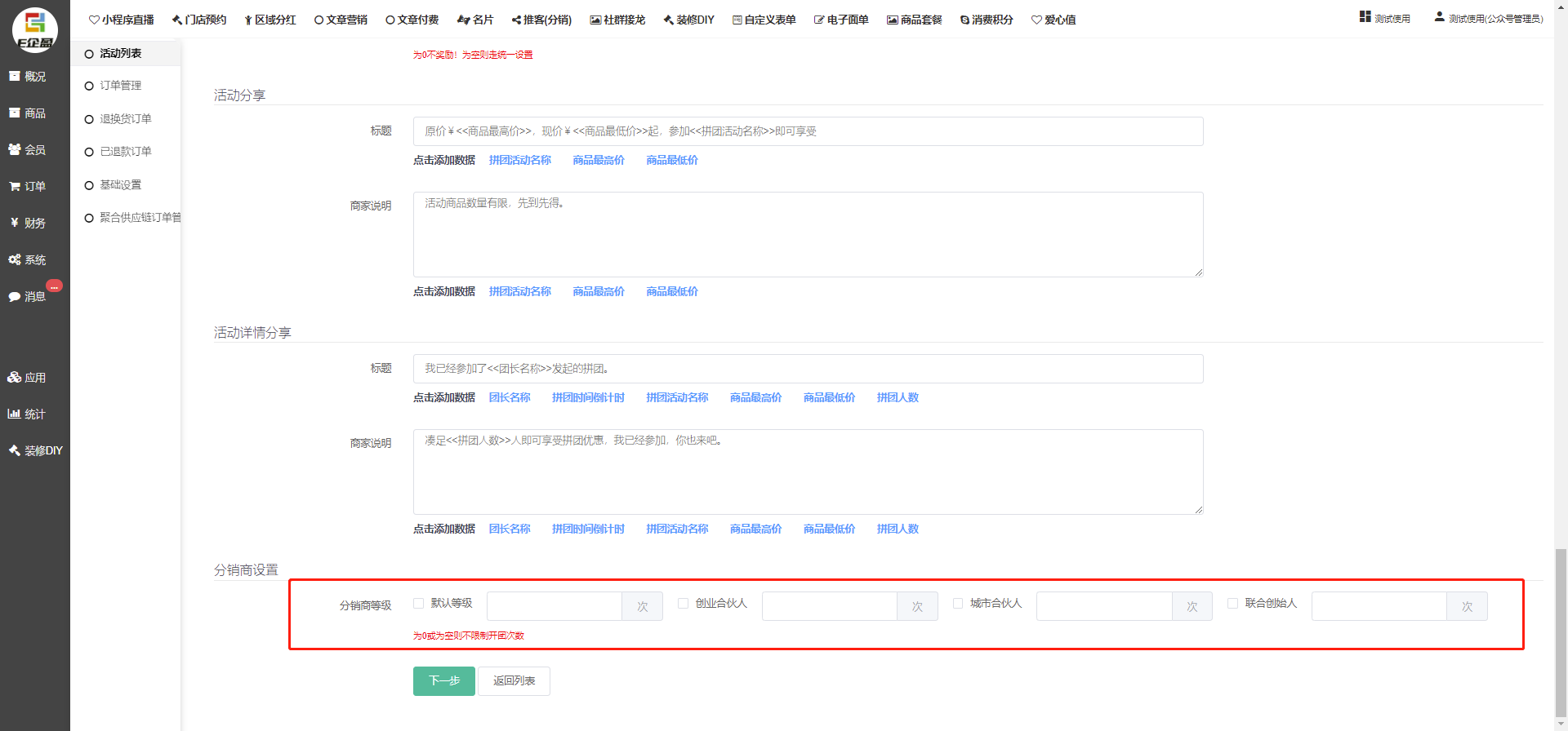 分销商设置:不同的分销身份,可设置不同的开团次数