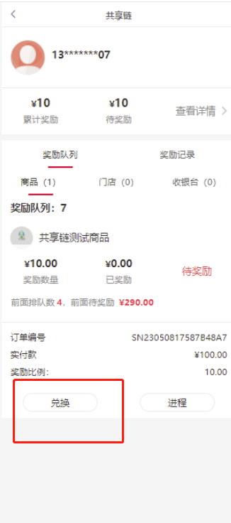 会员前端共享链界面,可点击抽奖功能抽取其他待返奖励比列。
