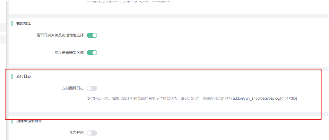 7)支付回调日志:支付回调日志,如果出现手机付款而后台显示待付款状态,请开启日志,查错误 日志路径为:addon/yun_shop/data/paylog/[公众号ID]