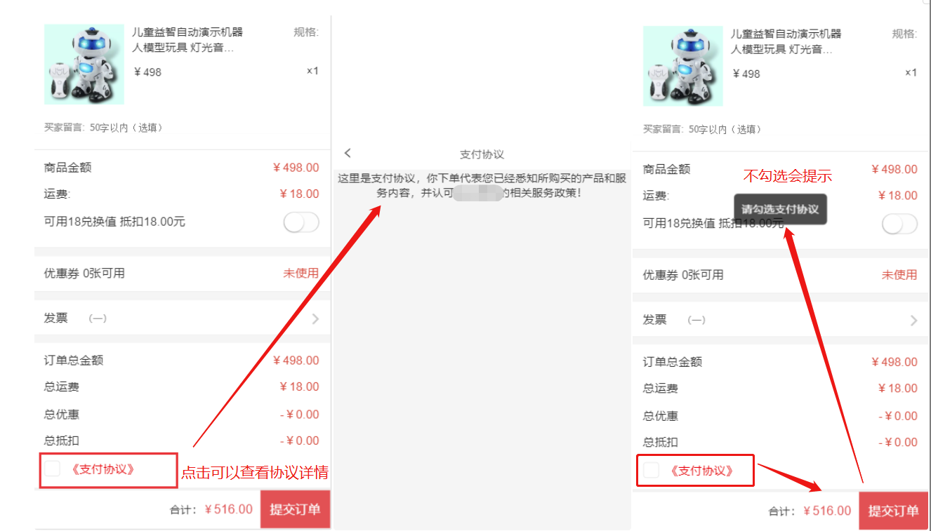 用户下单时可以查看支付协议,勾选协议后才能进行下单,如下图: