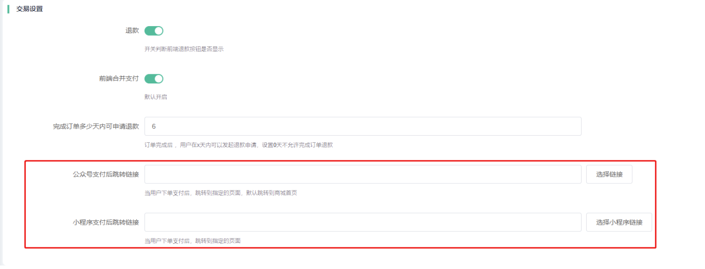 4)公众号支付后跳转链接、小程序支付后跳转链接:当用户下单支付后,跳转到指定的页面,(公众号:默认跳转到商城首页)